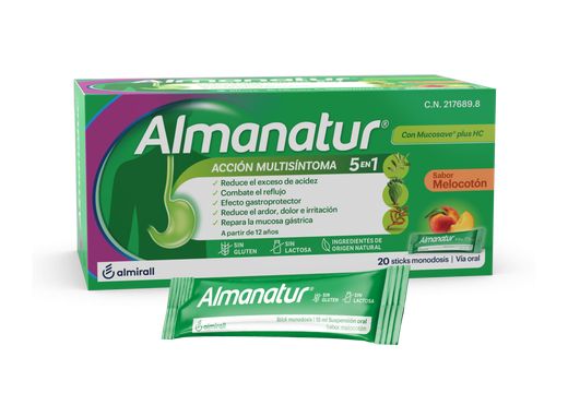 Almanatur es un producto natural para aliviar los síntomas del ardor y la acidez gástrica. Contiene activos naturales que protegen la mucosa para evitar sensación de molestia. 20 stocks de melocoton. Apto a partir de 12 años.
