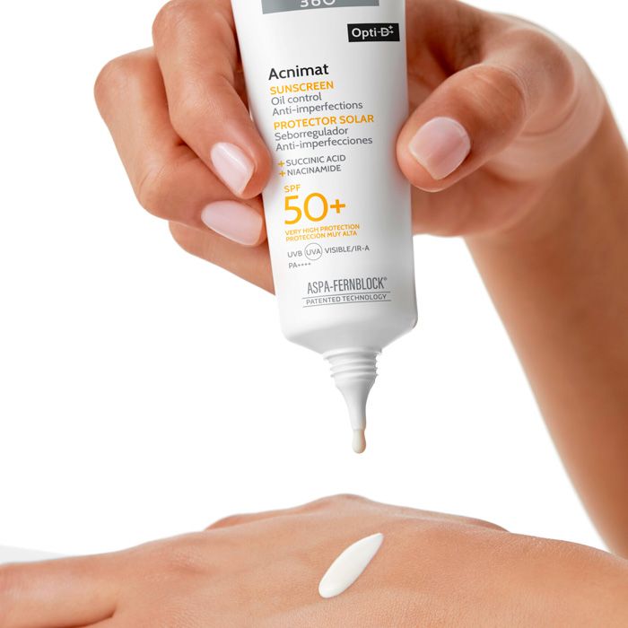 Heliocare 360º Acnimat SPF 50+ és un fotoprotector facial d'ús diari, especialment formulat per a pells grasses amb tendència acneica. Ofereix una protecció solar d'ampli espectre (UVB, UVA, llum visible i infraroja) gràcies a la seva avançada ASPA-Fb prevenir i reparar el dany solar. La seva fórmula incorpora actius seborreguladors i anti-imperfeccions com l'àcid succínic i la niacinamida, cosa que permet mantenir la pell matificada per més de 12 hores, reduint visiblement el sèu i les brillantors sense obstruir els porus.