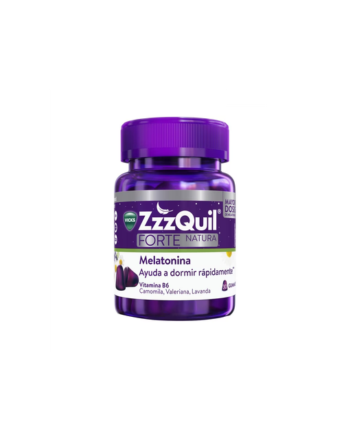 ZZZQuil Forte Gummies és un complement alimentari en format gomina, formulat amb melatonina, extractes de plantes (com valeriana, camomil·la i lavanda) i vitamina B6, dissenyat per ajudar-te a agafar el son de forma natural, sense crear dependència. El seu format en gominoles el fa agradable i fàcil de prendre, ideal per a persones que tenen dificultats per empassar càpsules o comprimits.